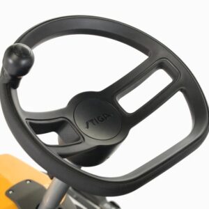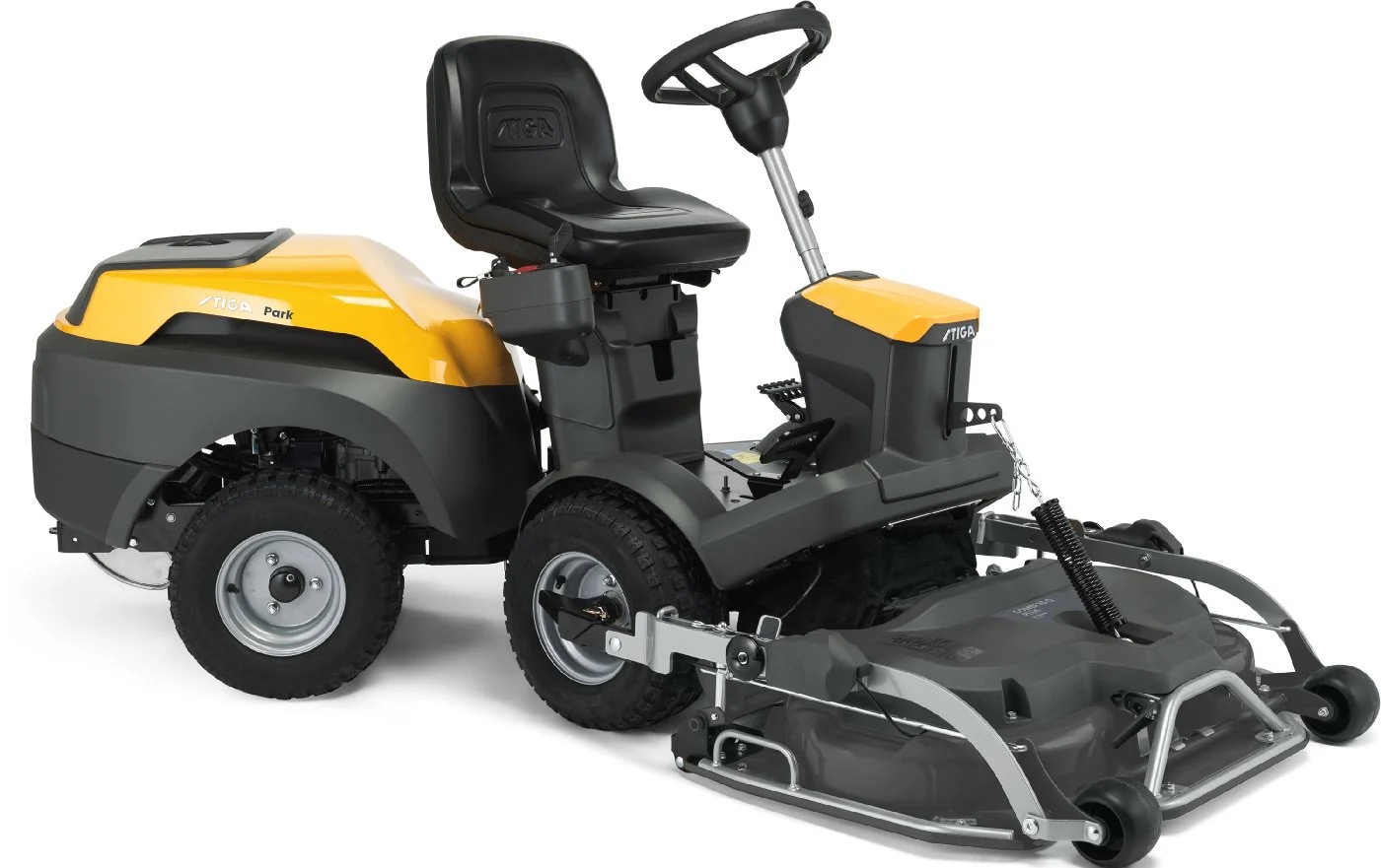 Der mit einem 432-cm³-Einzylindermotor ST 450 von STIGA ausgestattete Frontmäher Park 500 bietet dir zuverlässiges, bequemes Fahrvergnügen beim Mähen. Die 50:50-Knickservolenkung des Frontmähers und die innovative Chassis-Bauweise erleichtern das Lenken und Umfahren um Bäume und Beete. Das frontmontierte Mähwerk des Park 500 gibt dir freie Sicht nach vorn, ein leichtes Erreichen von Ecken und Winkeln und wunderbare Ergebnisse an den Rasenkanten. Und da es sich um ein Schwebemähwerk handelt, gleitet es auch geschmeidig über unebene Untergründe. Mit seinem QuickFlip-Mechanismus kannst du das Mähwerk innerhalb von Sekunden werkzeuglos in eine Reinigungsposition bringen. Das Fahren dieses Frontmähers ist so einfach dank seines seitlich angebrachten Armaturenbretts mit praktischen Steuerungen – einschließlich elektronischer Einstellung der Schnitthöhe. Damit du es auch wirklich bequem hast, ist der Sitz des Park 500 mit einer unterstützenden Rückenlehne ausgestattet und bietet jede Menge Beinfreiheit zum Auf- und Absteigen. Lehn dich einfach zurück, entspanne dich und genieße die Fahrt. Anhängerkupplung inklusive.